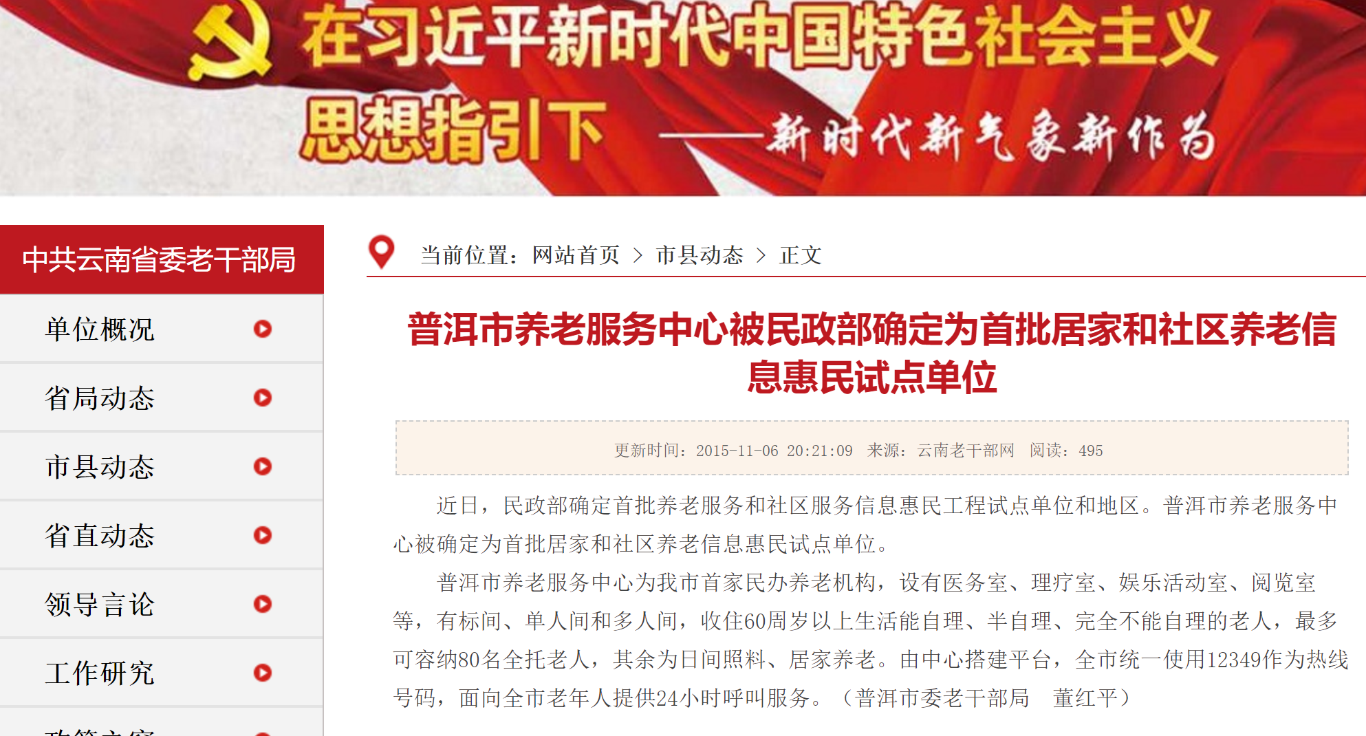民政部確定首批養老服務和社區服務信息惠民工程試點單位和地區。普洱市養老服務中心被確定為首批居家和社區養老信息惠民試點單位。